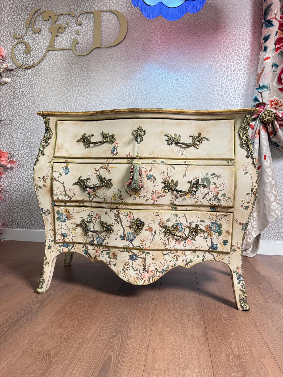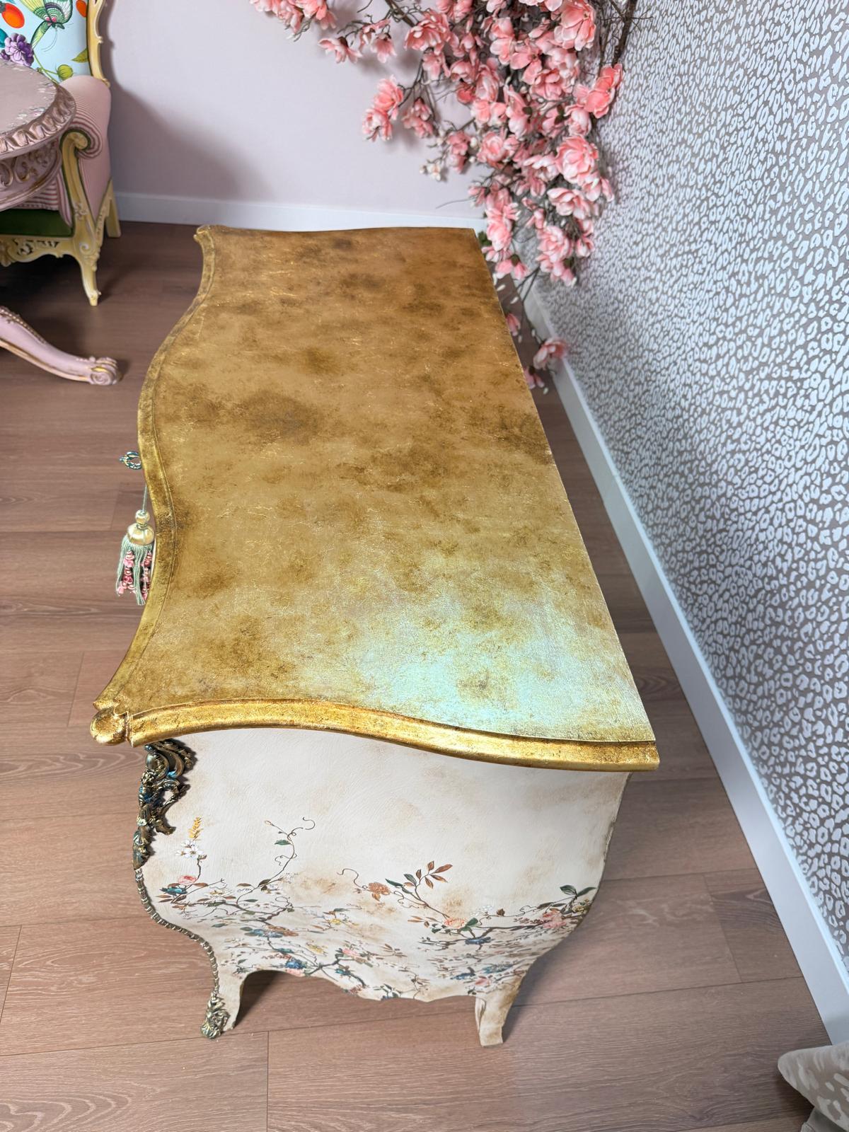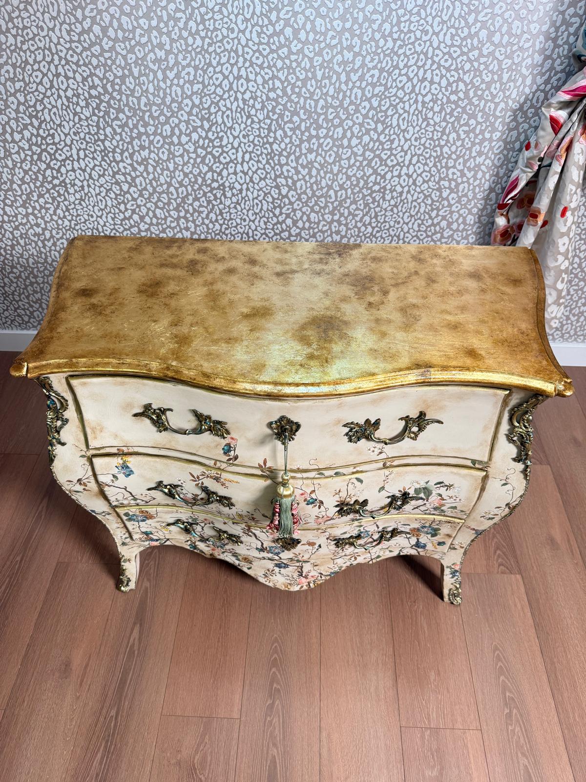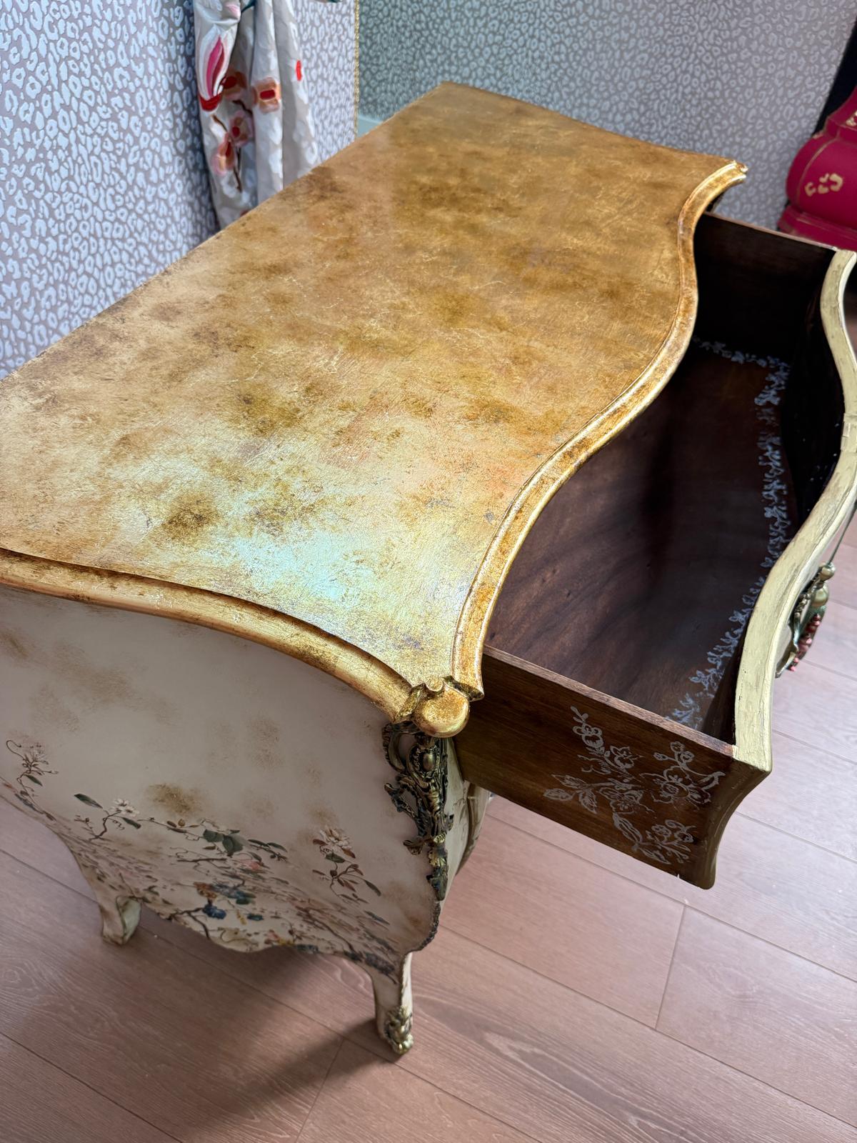 Chest of drawers with gold leaf application on the top and floral motifs on the body and inside of the drawers.