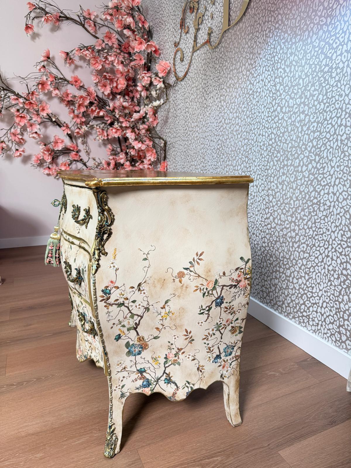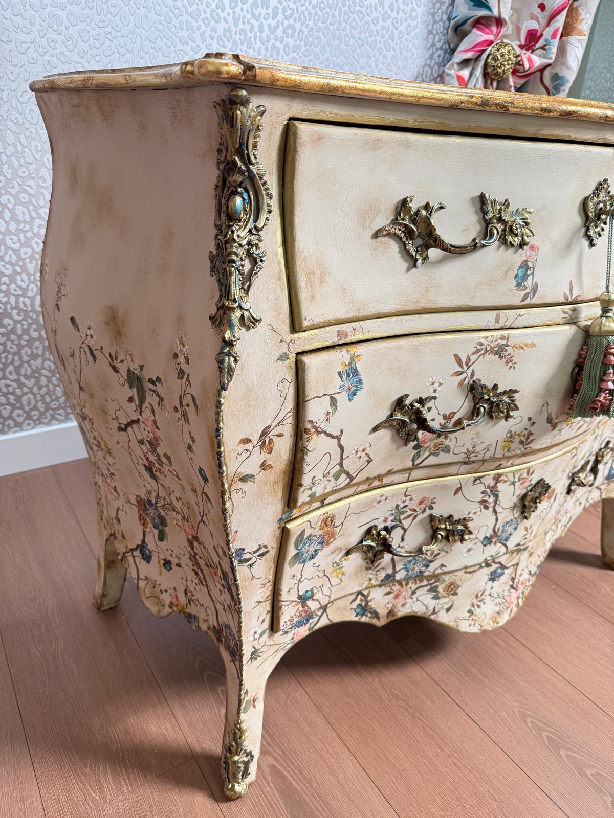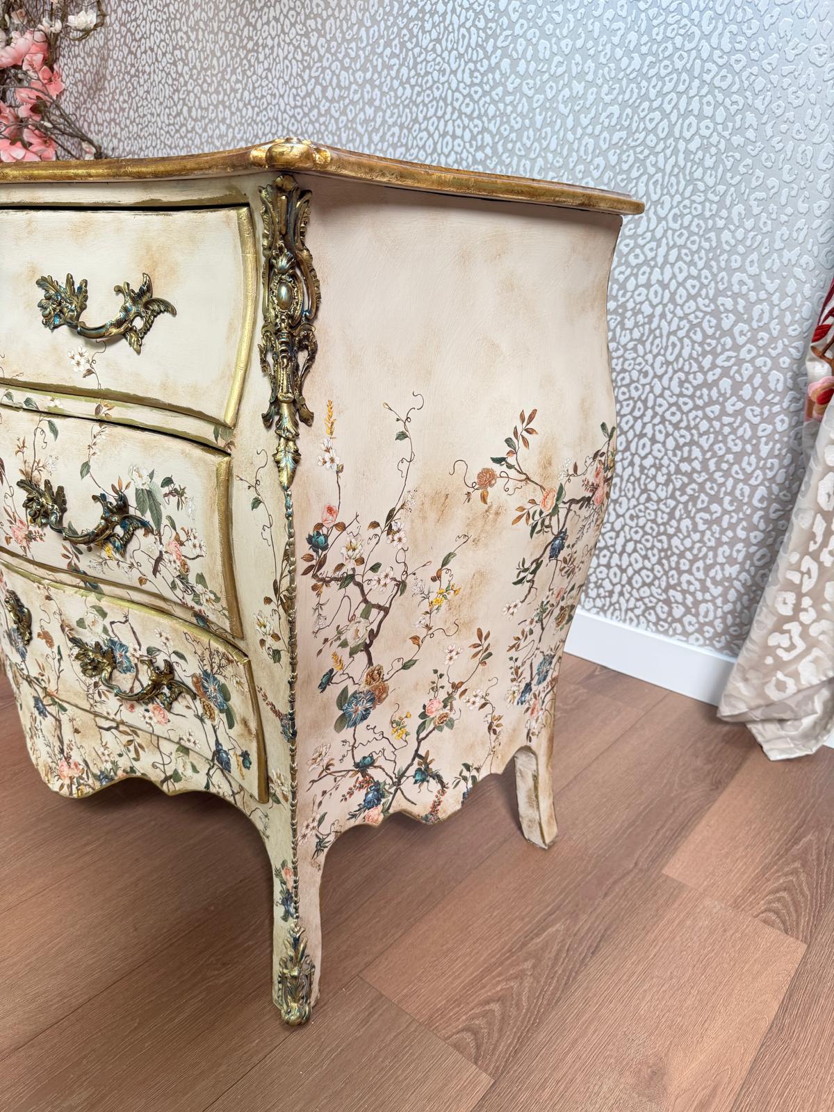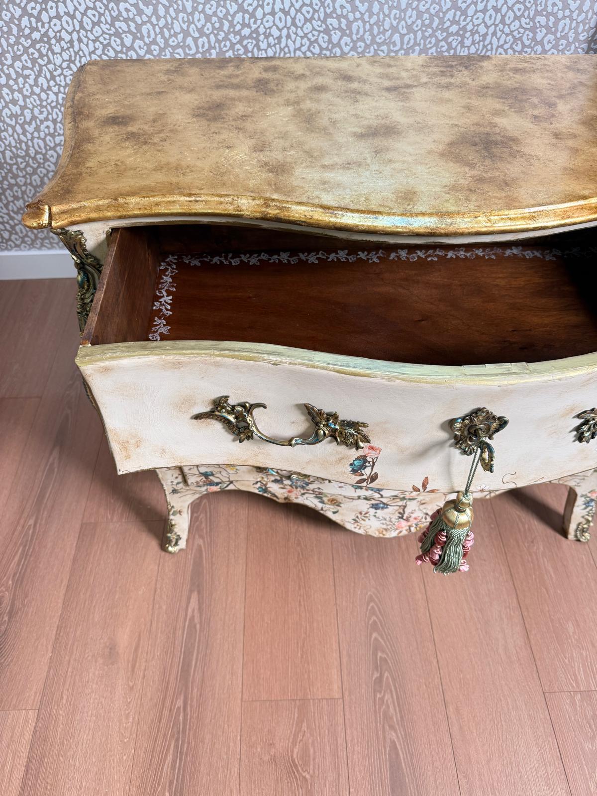 Chest of drawers with gold leaf application on the top and floral motifs on the body and inside of the drawers.