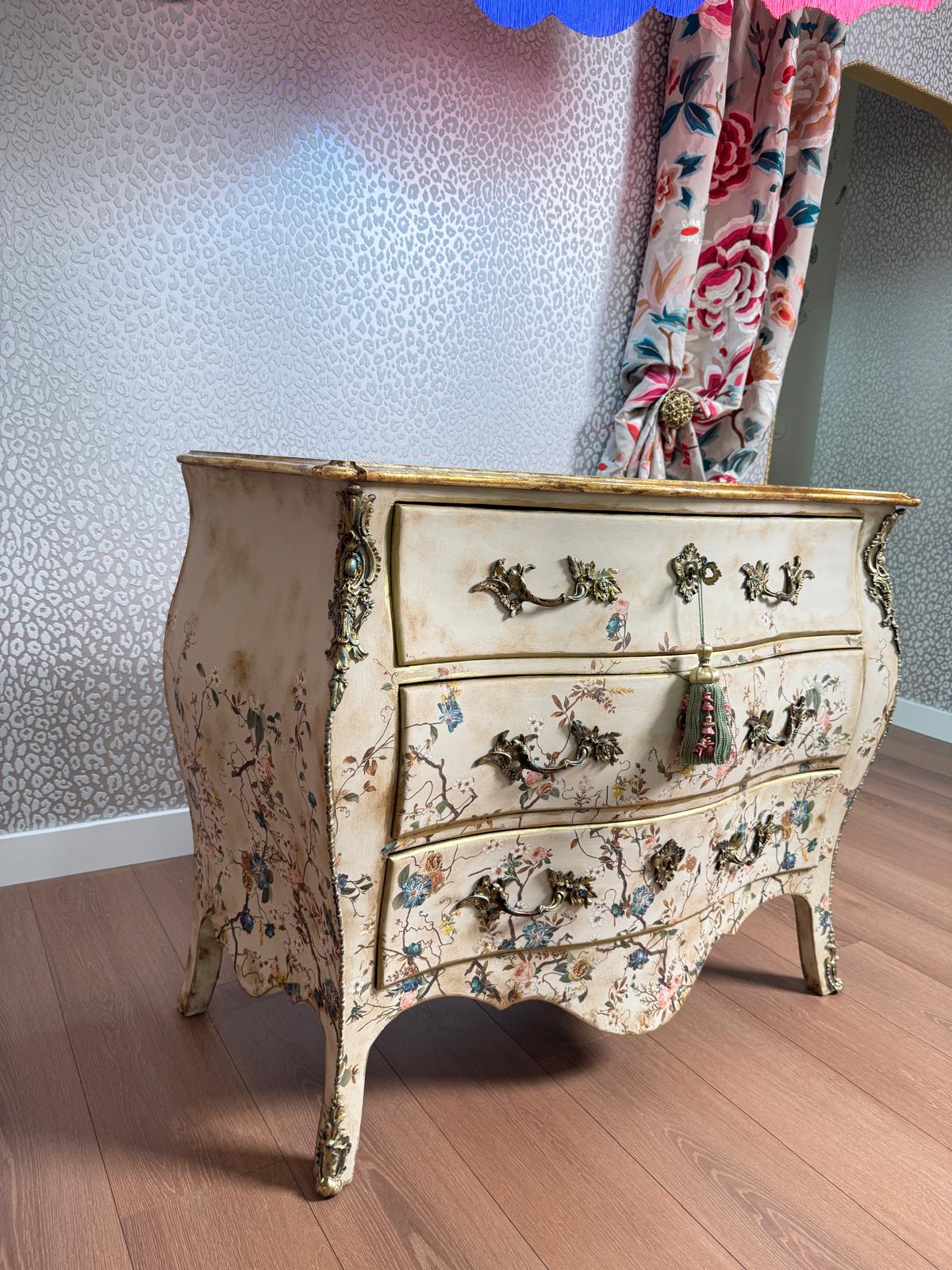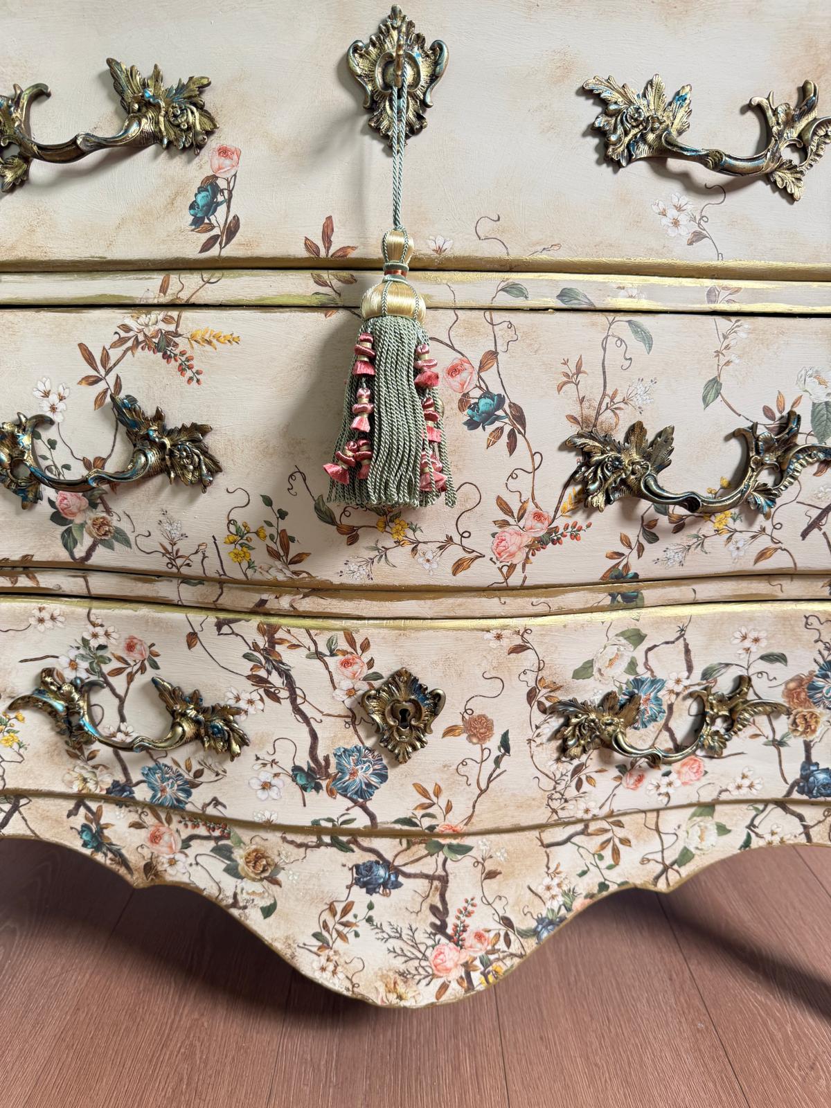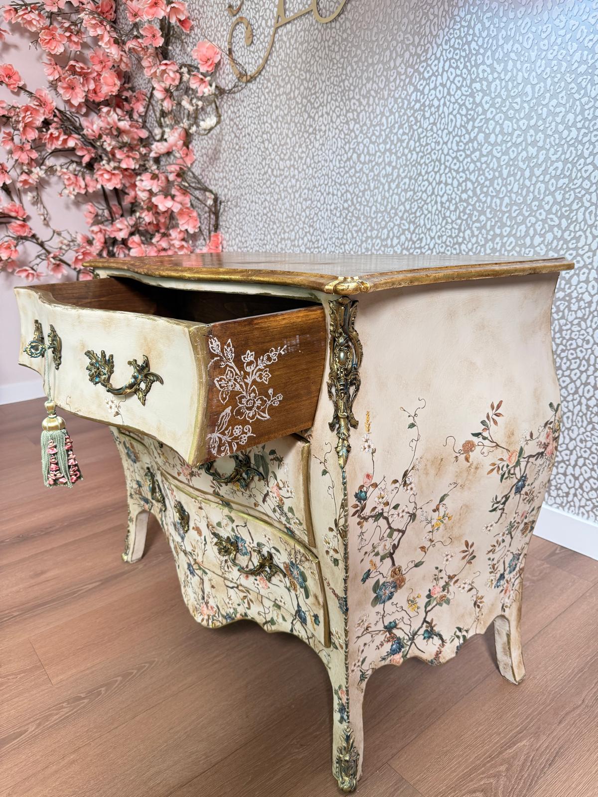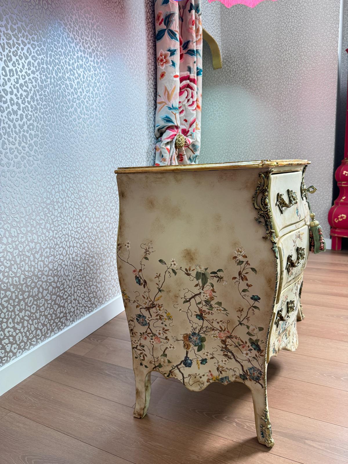 Chest of drawers with gold leaf application on the top and floral motifs on the body and inside of the drawers.