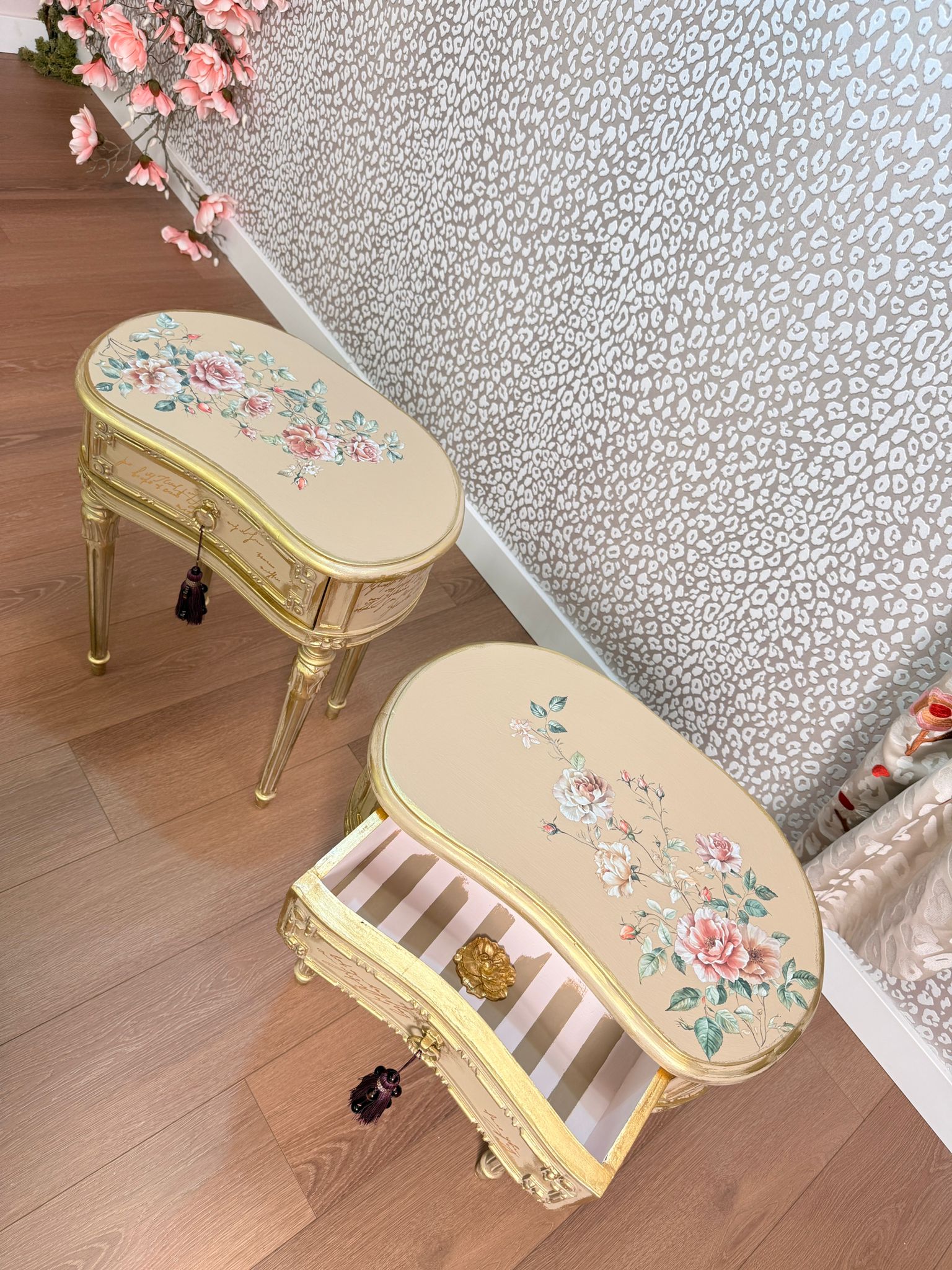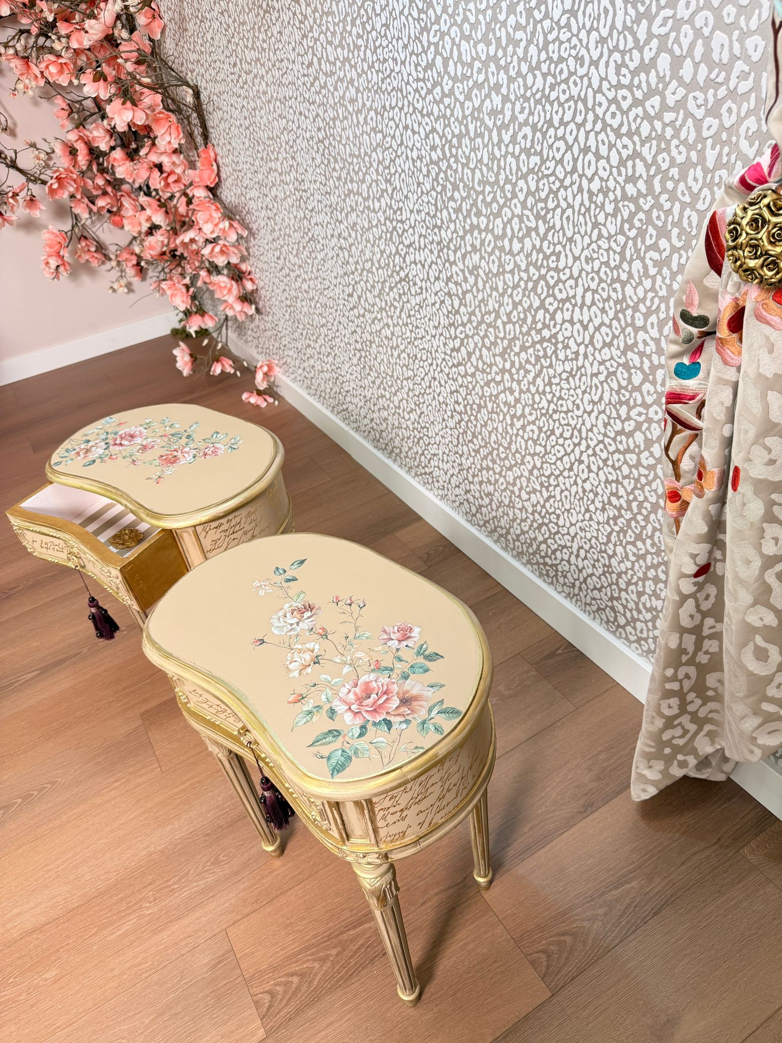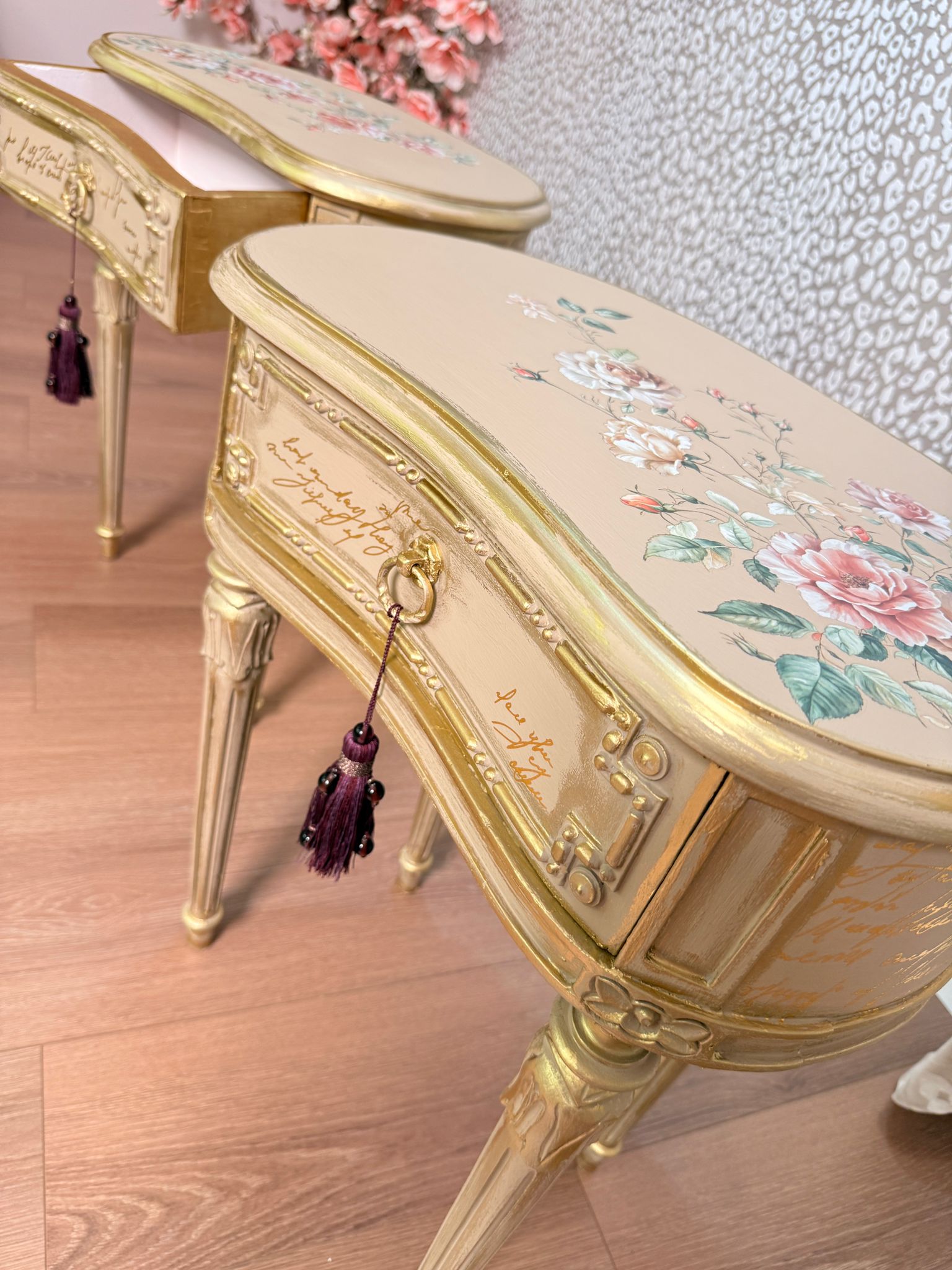 Bedside tables with floral motifs on the top, gold leaf application on the drawers, and gold decorative wax on the accents.