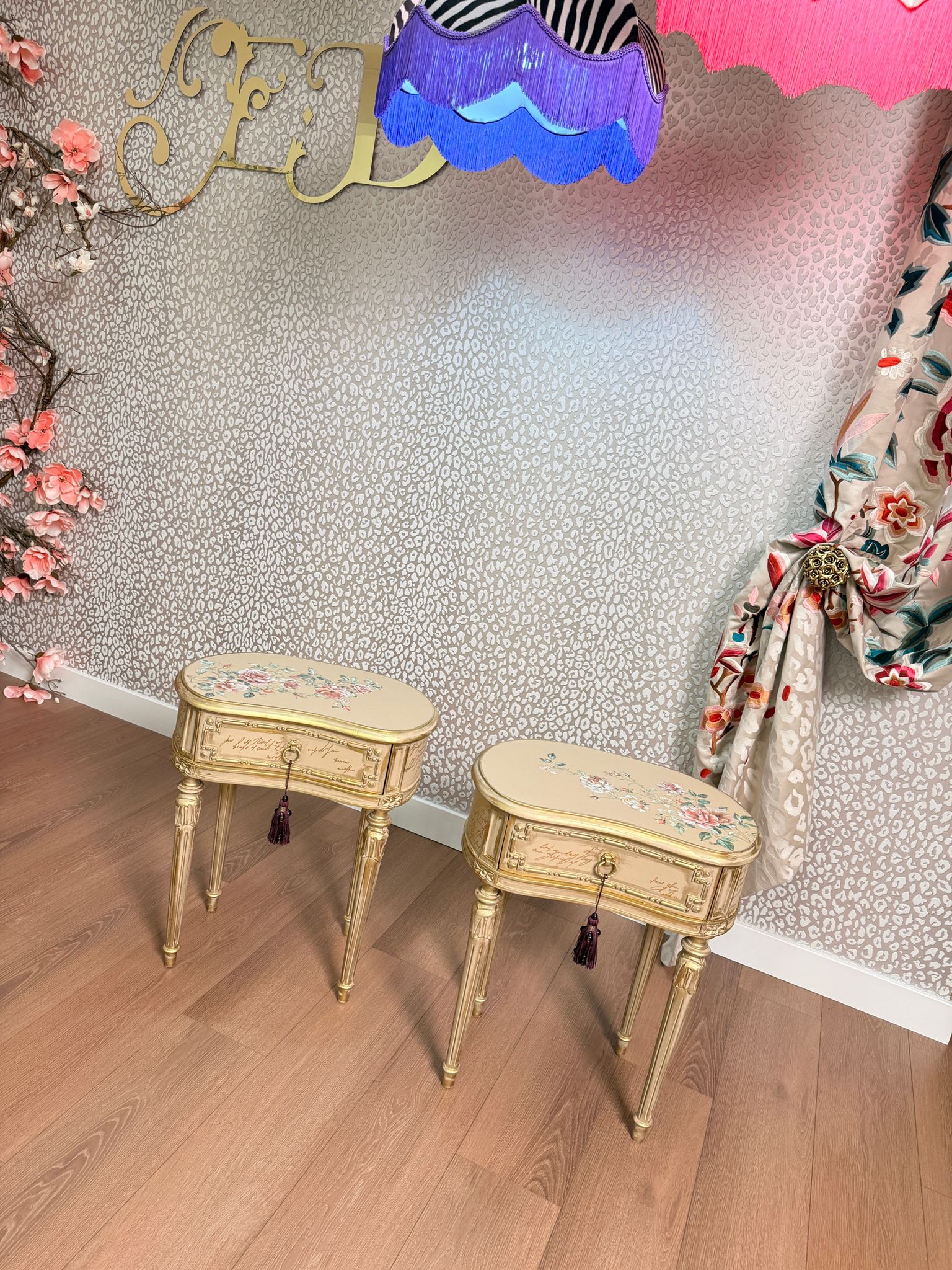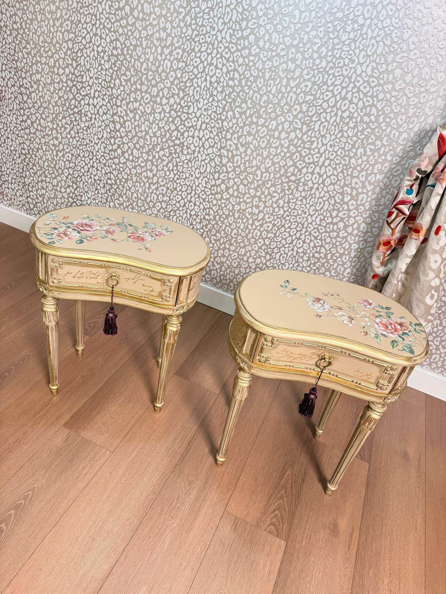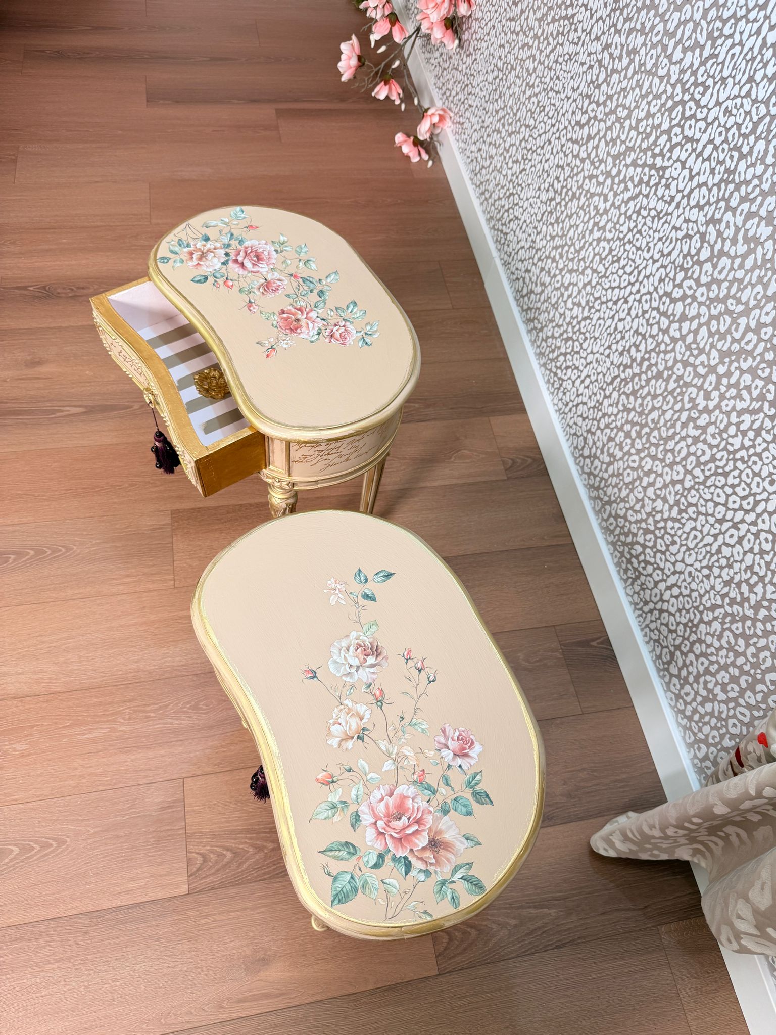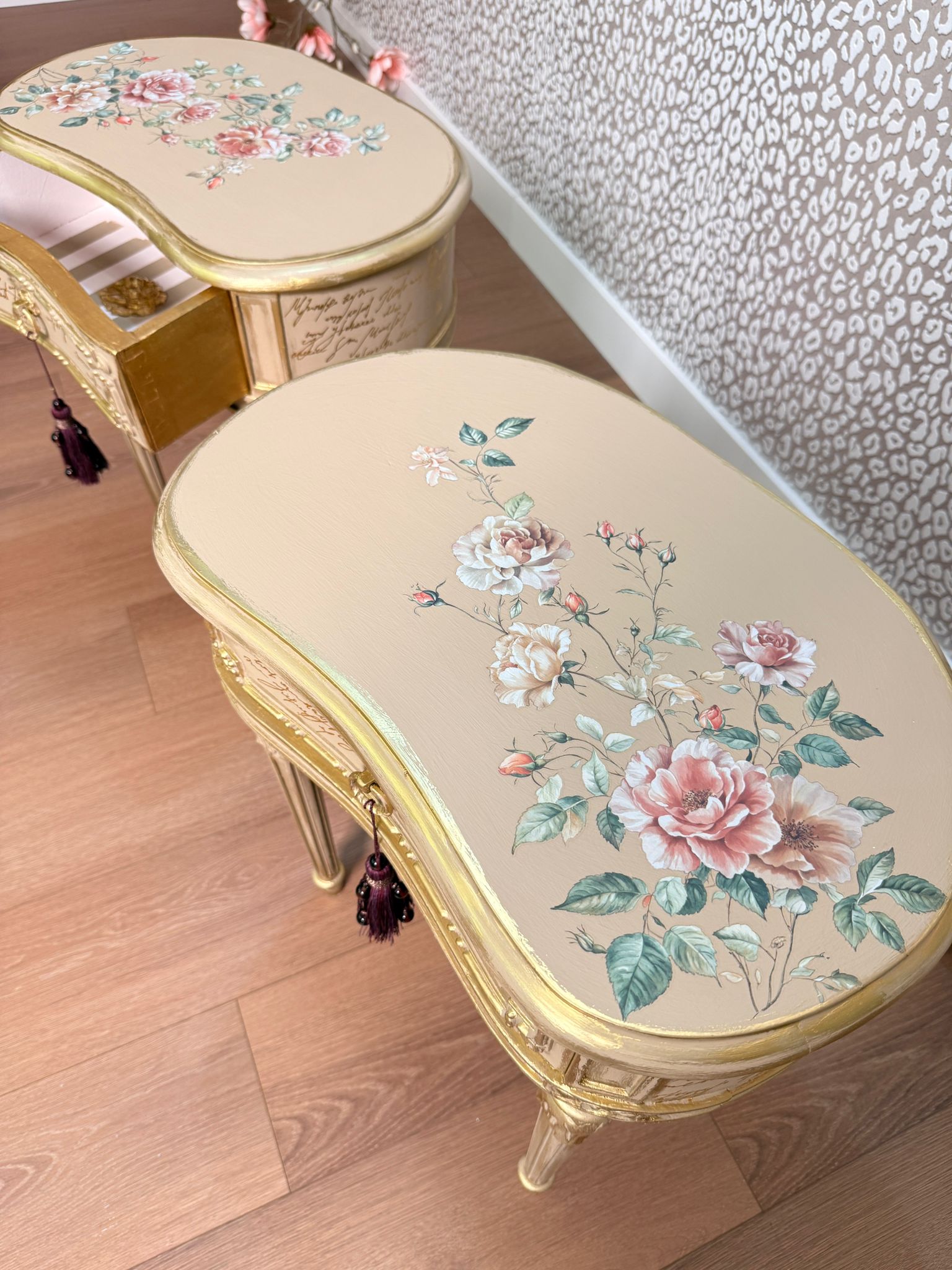 Bedside tables with floral motifs on the top, gold leaf application on the drawers, and gold decorative wax on the accents.