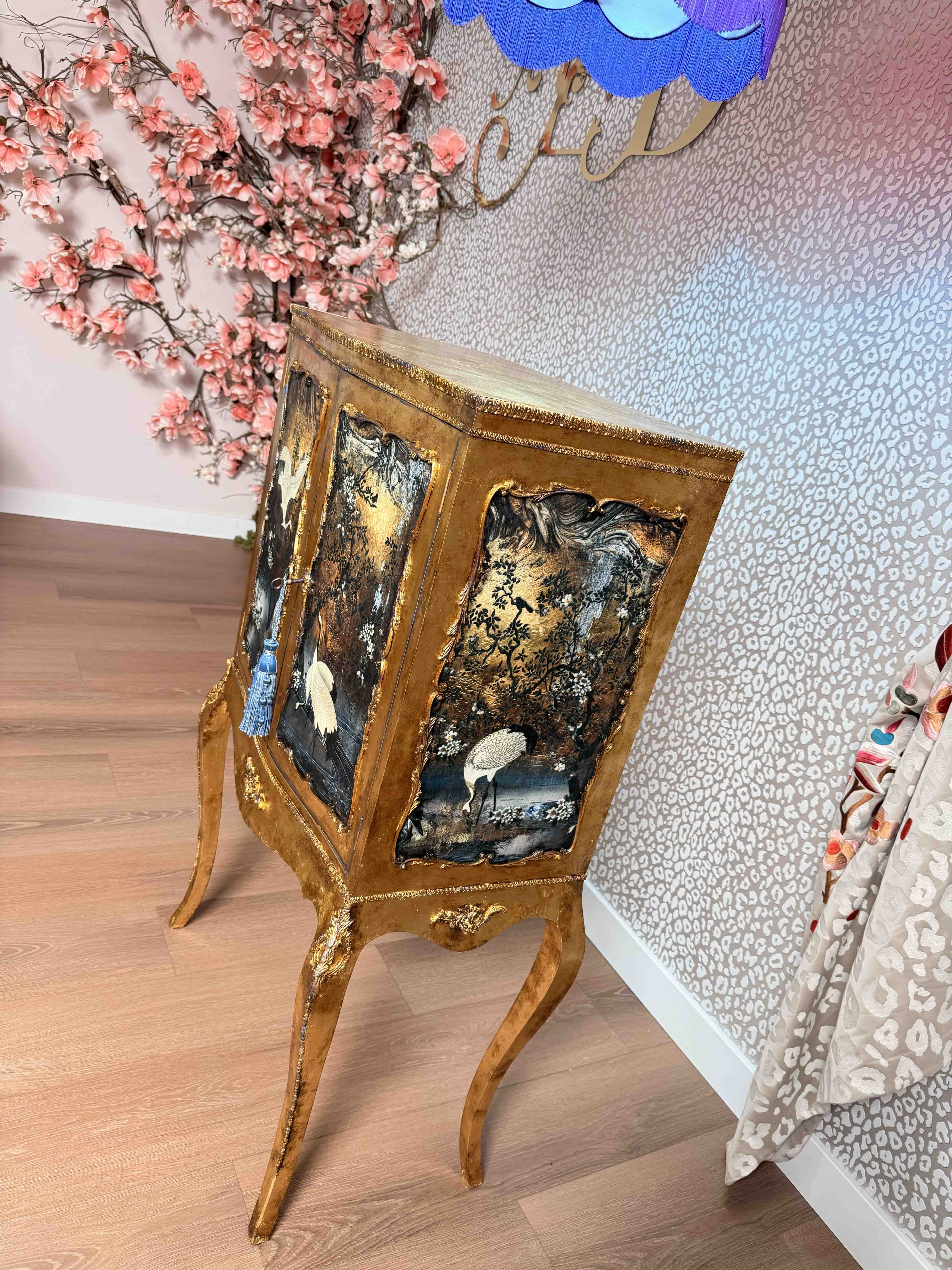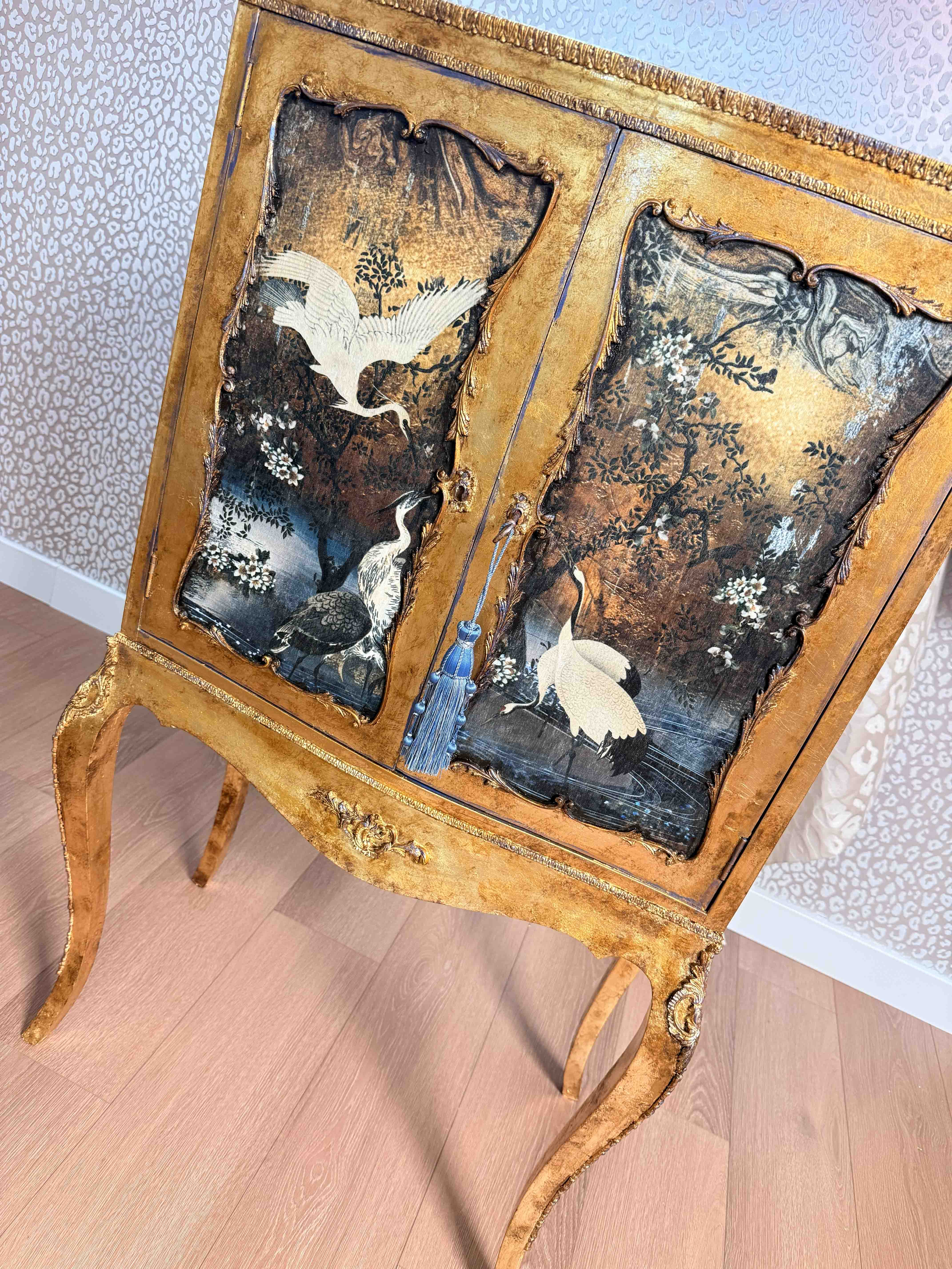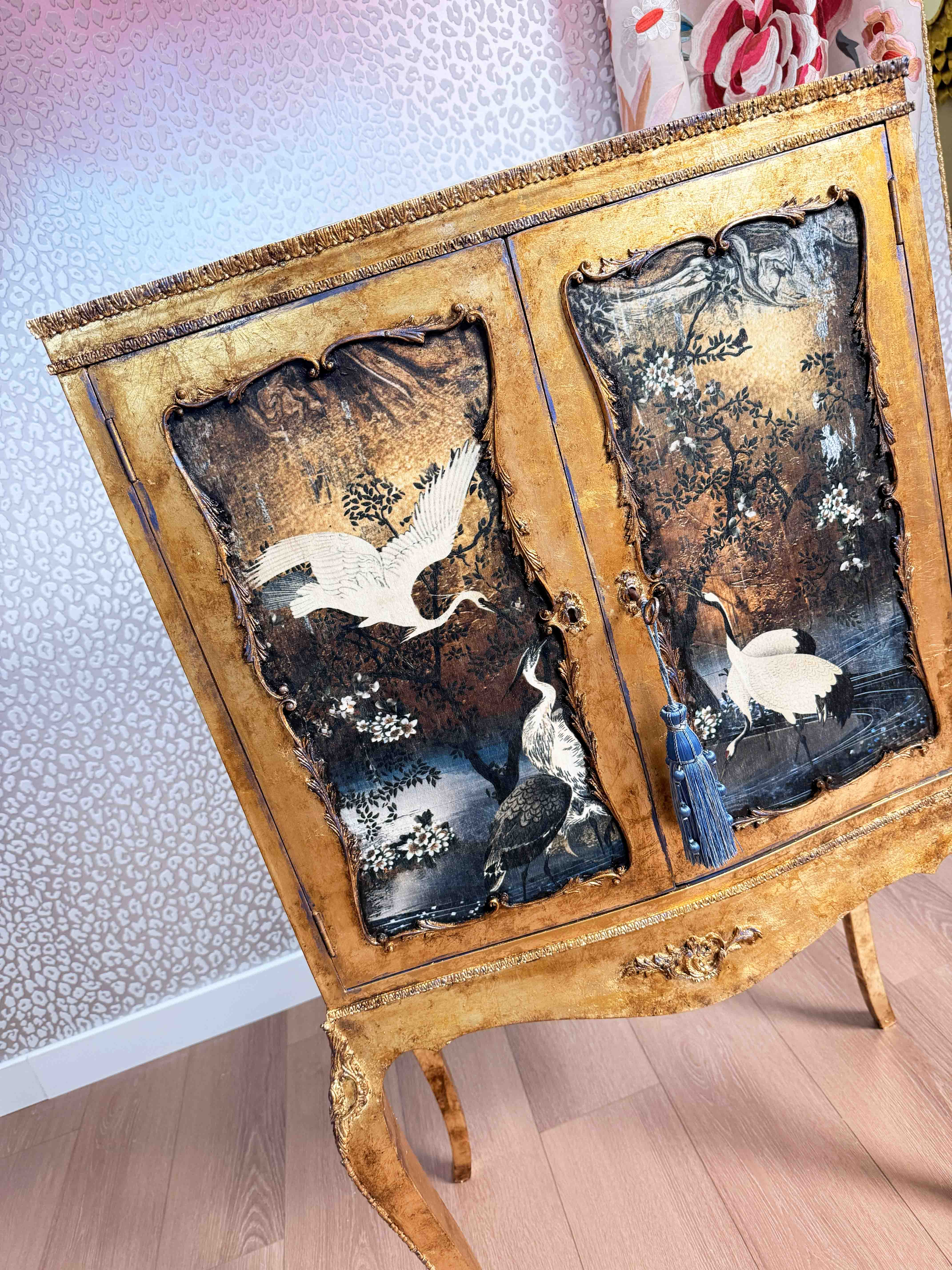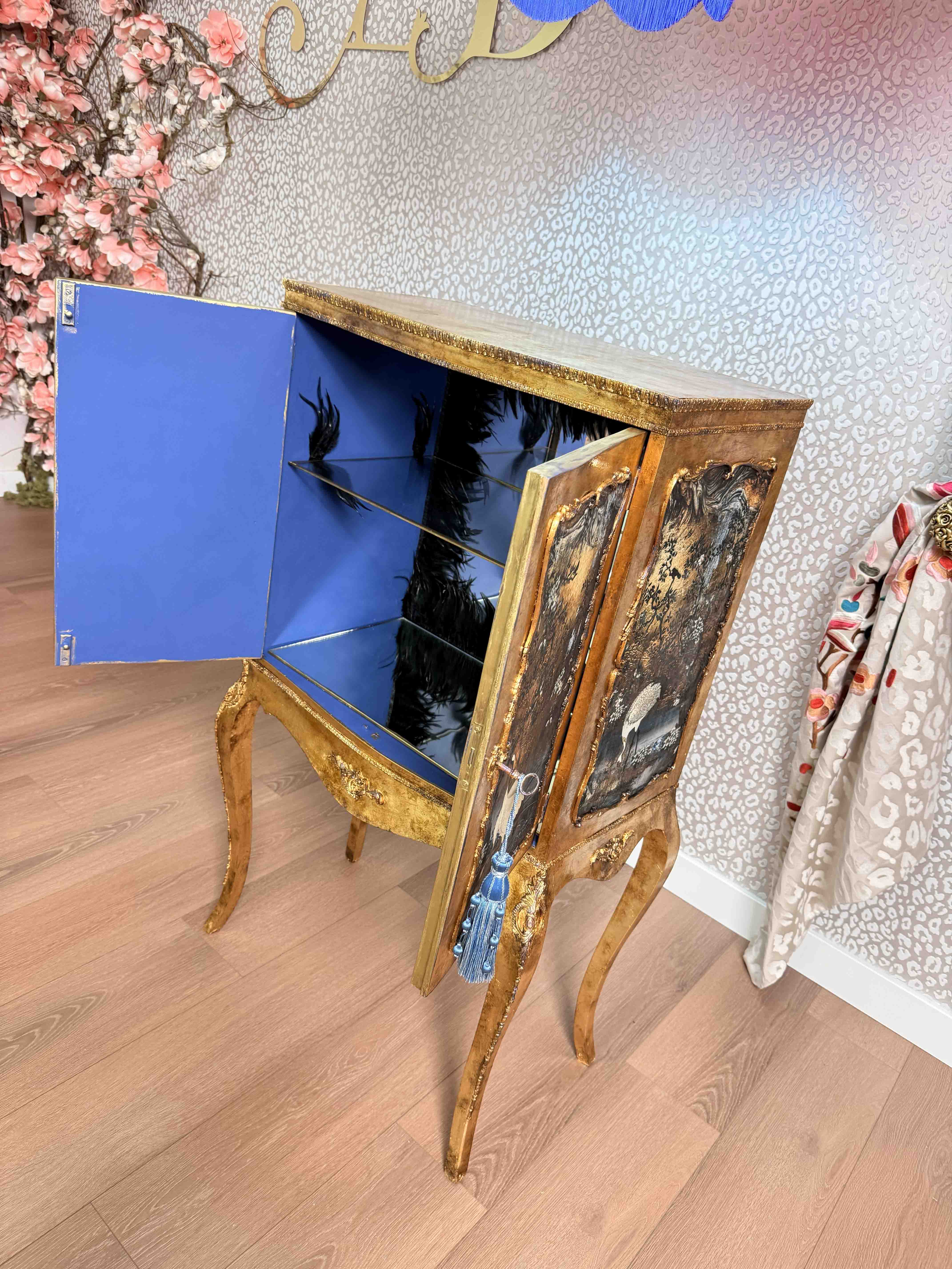 Bar cabinet with gold leaf and decorative fiber, featuring flora and fauna motifs.