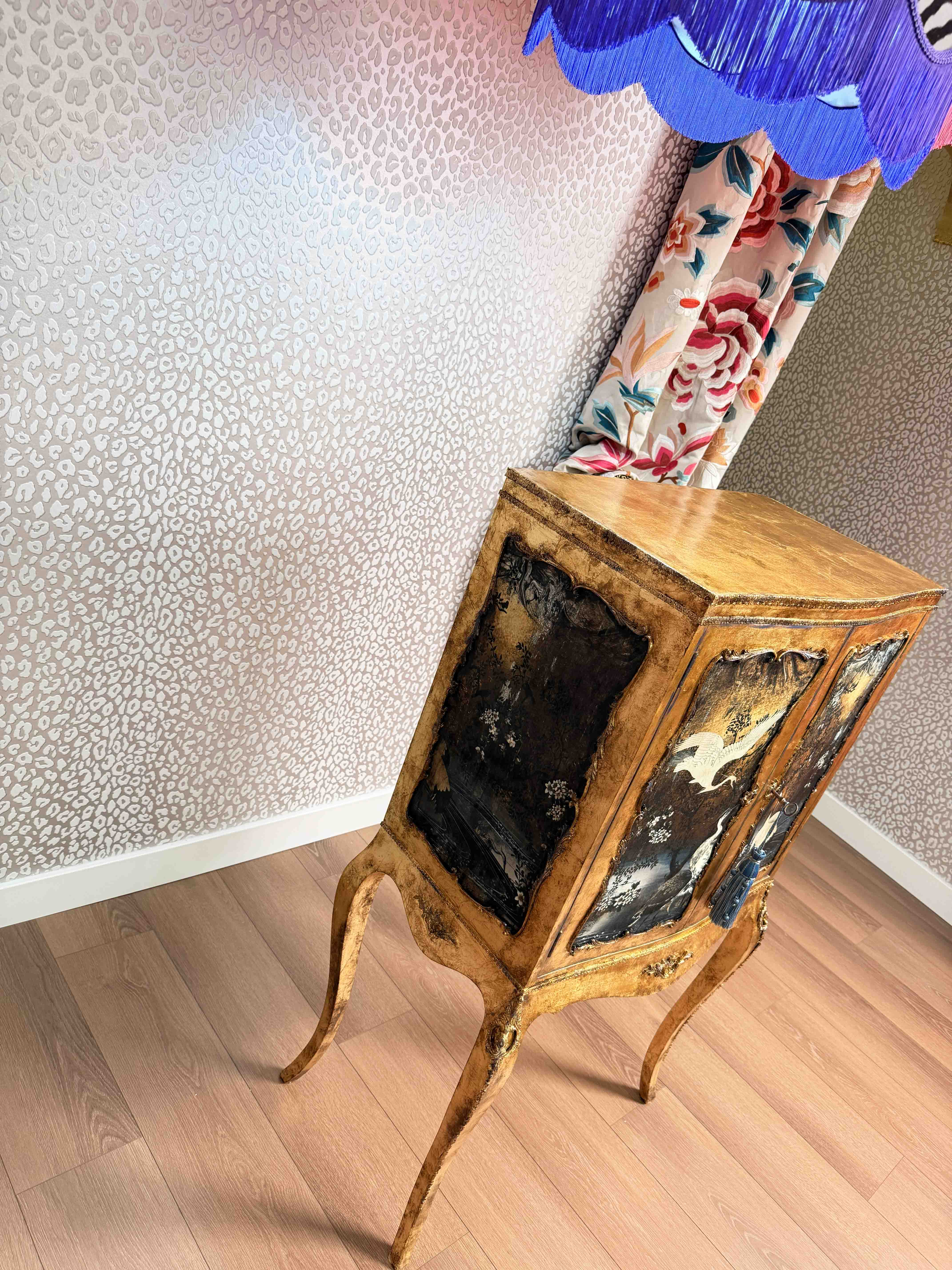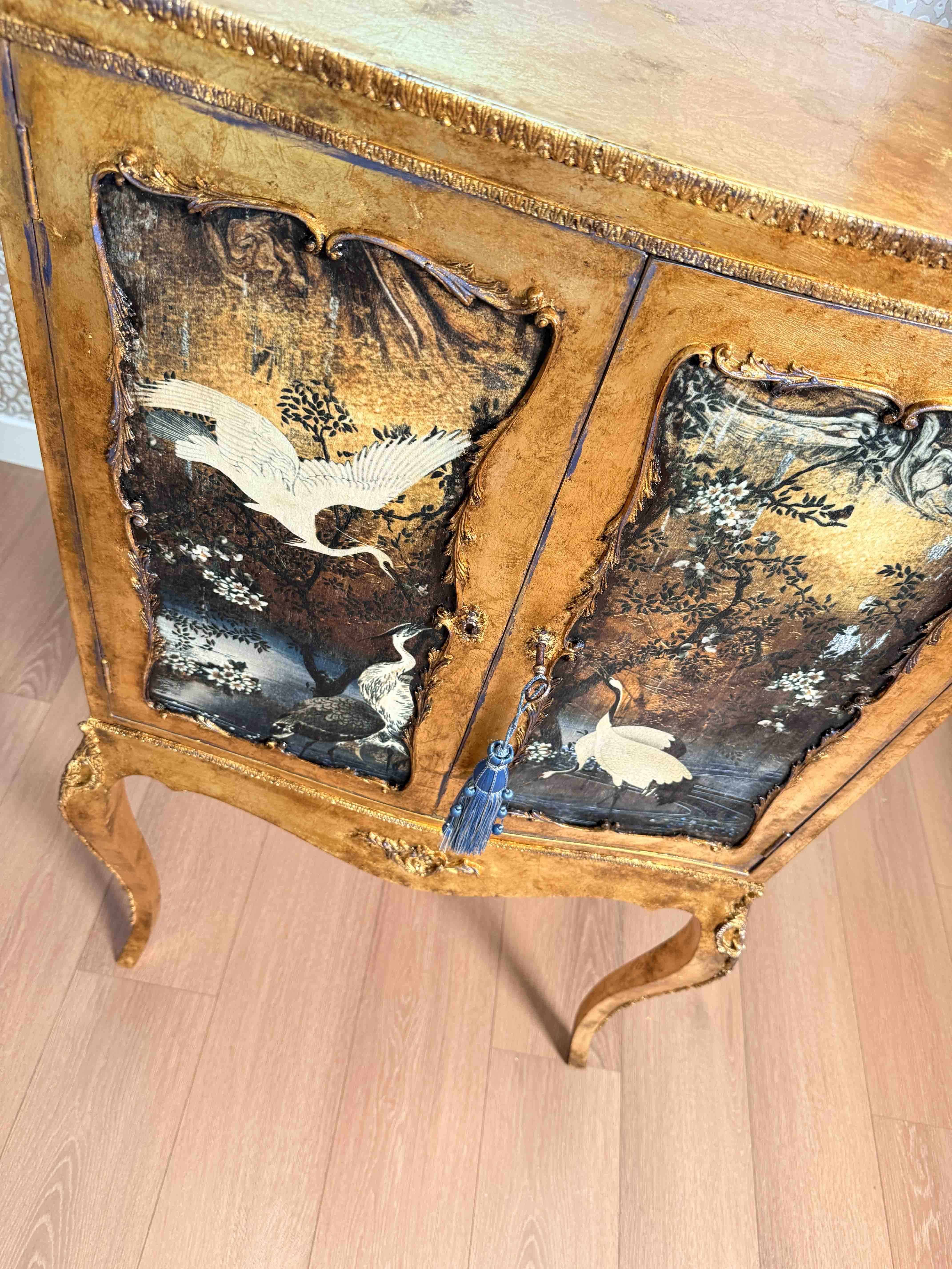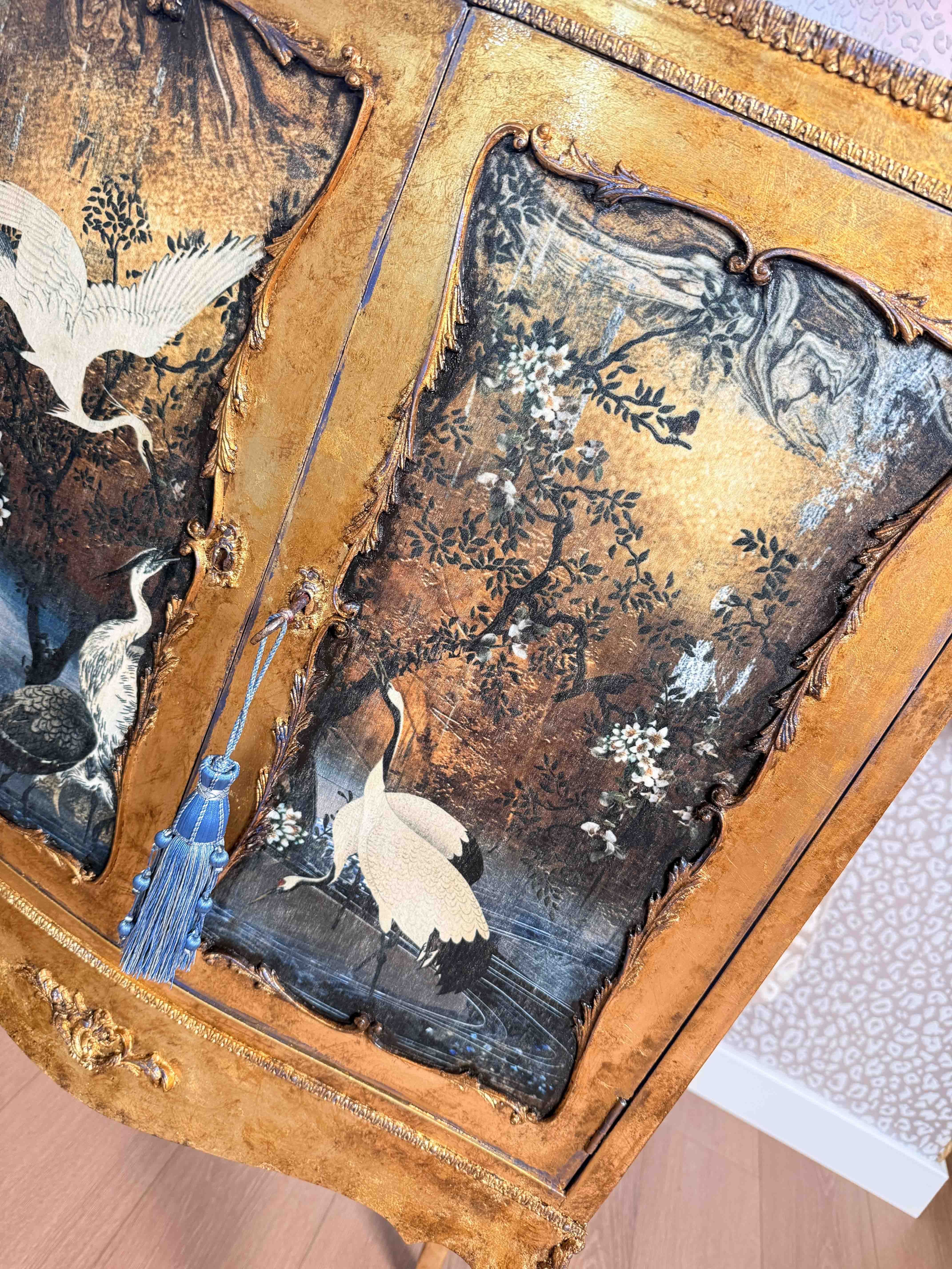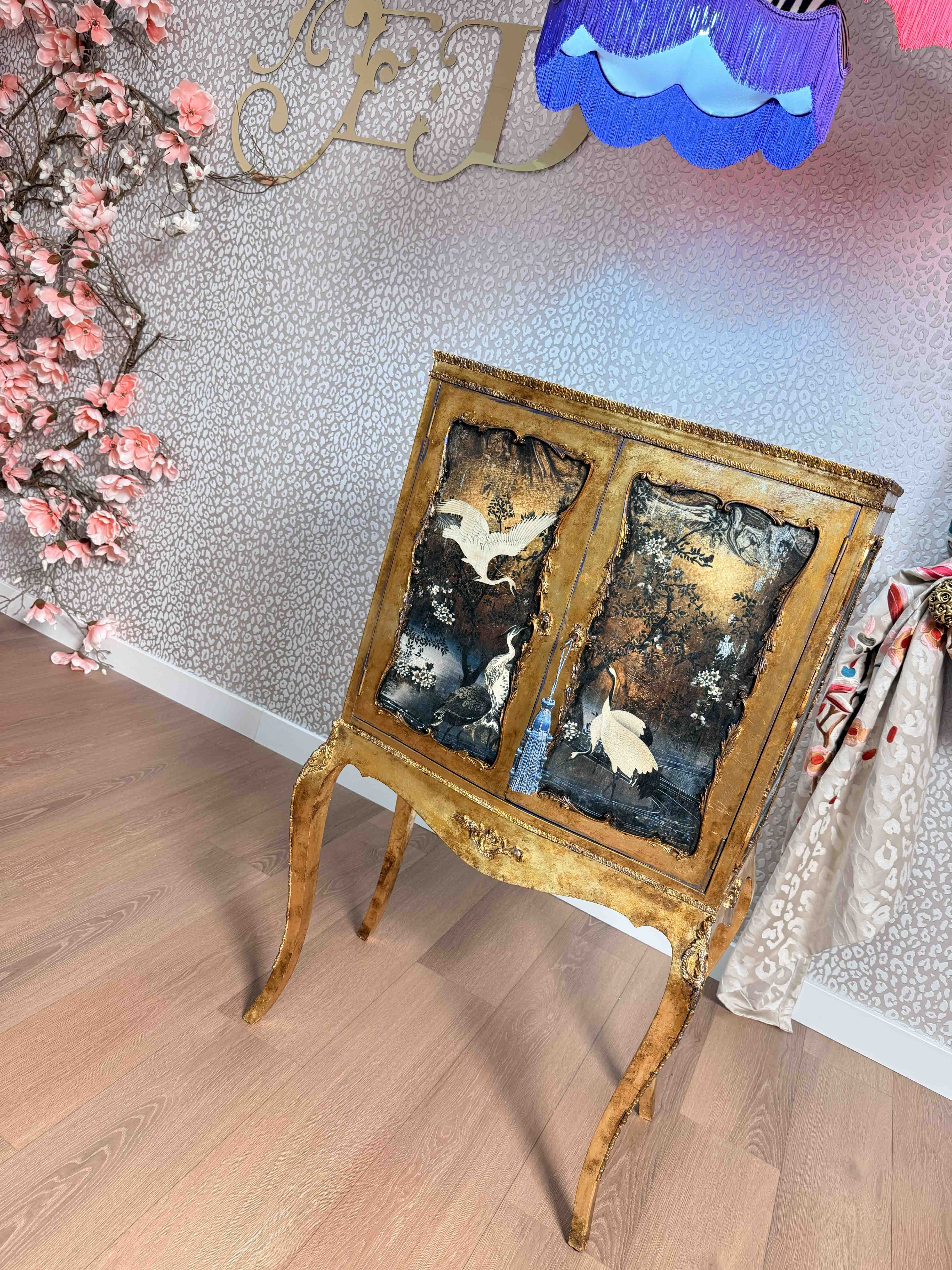 Bar cabinet with gold leaf and decorative fiber, featuring flora and fauna motifs.