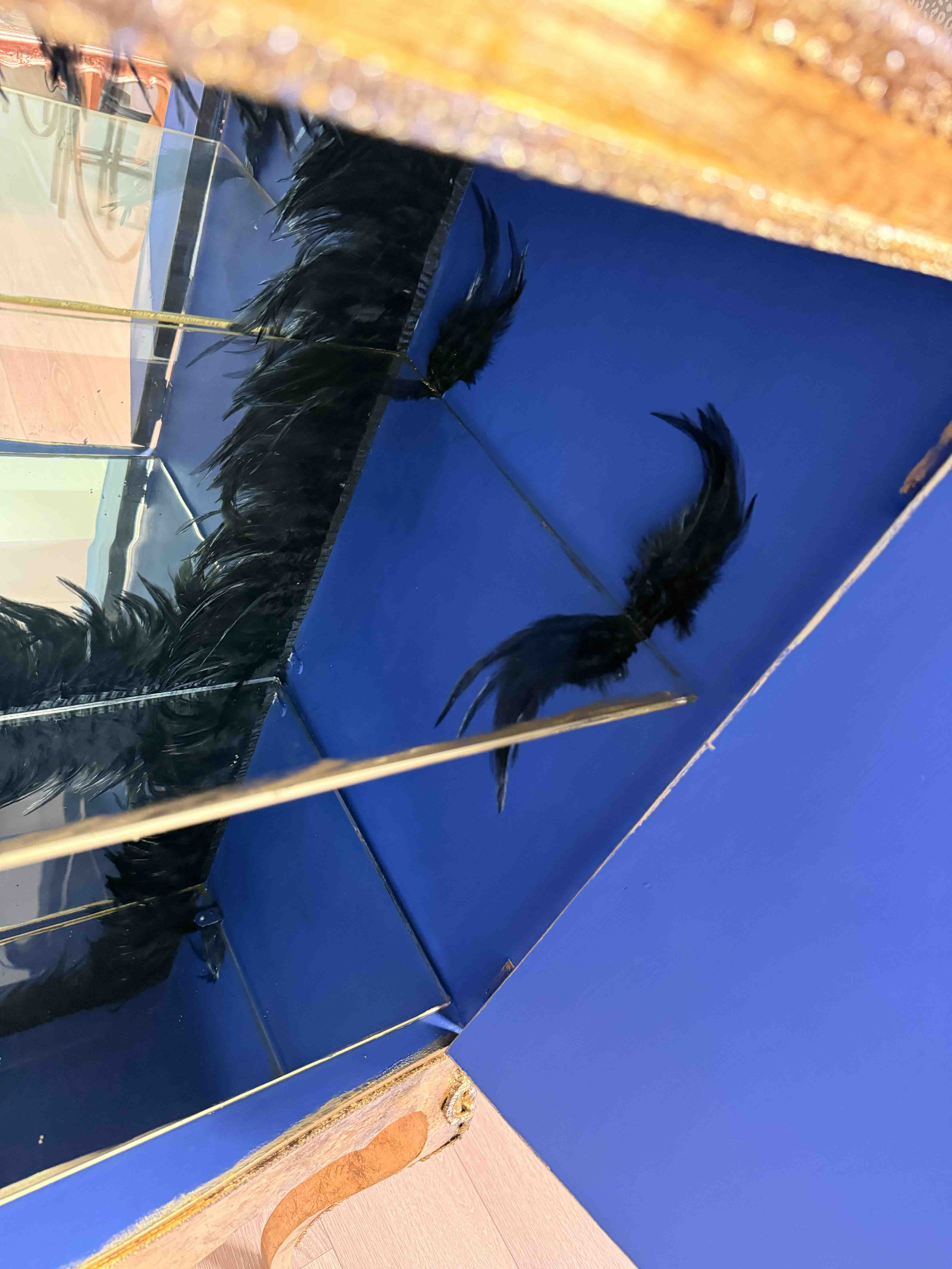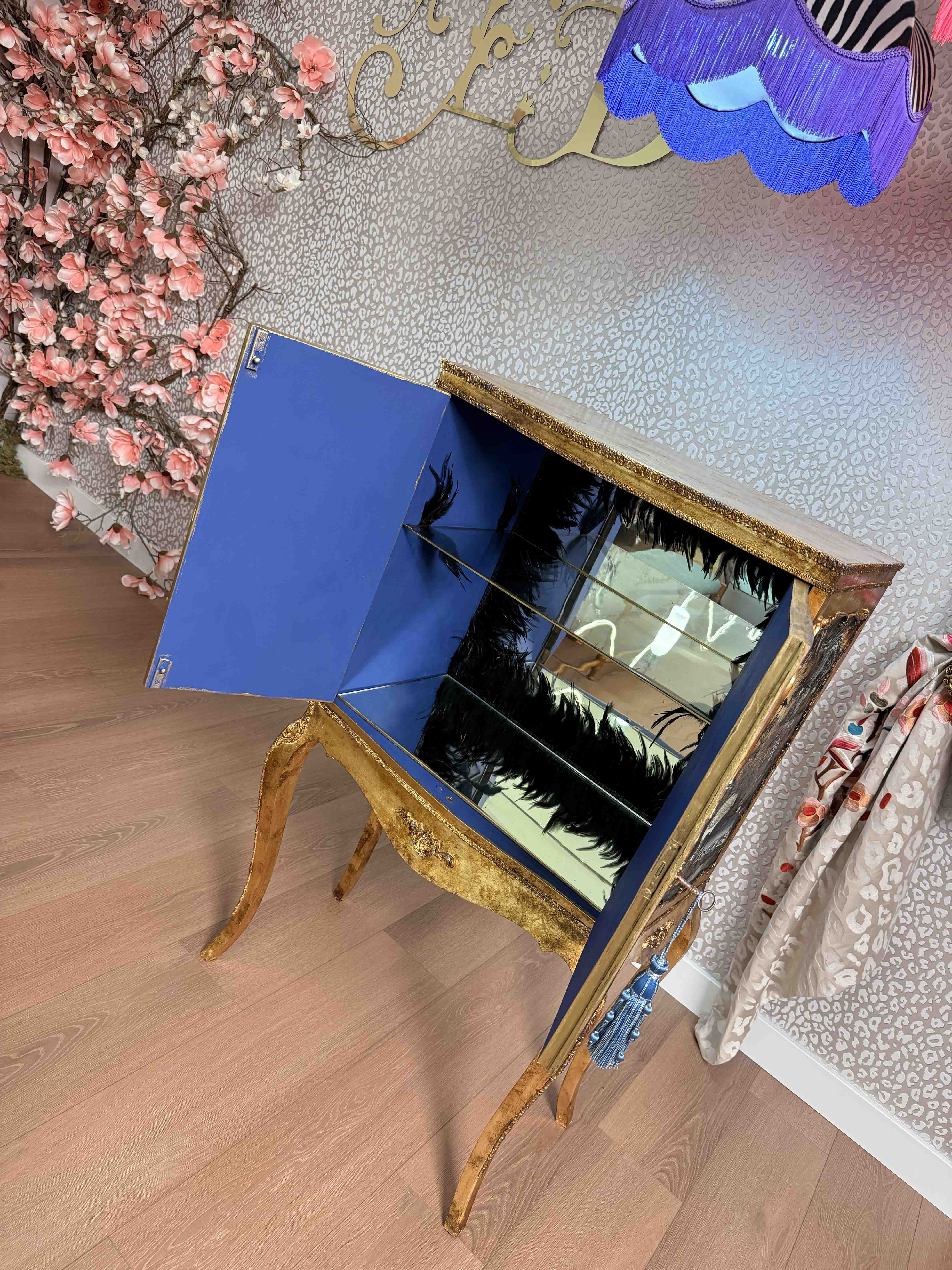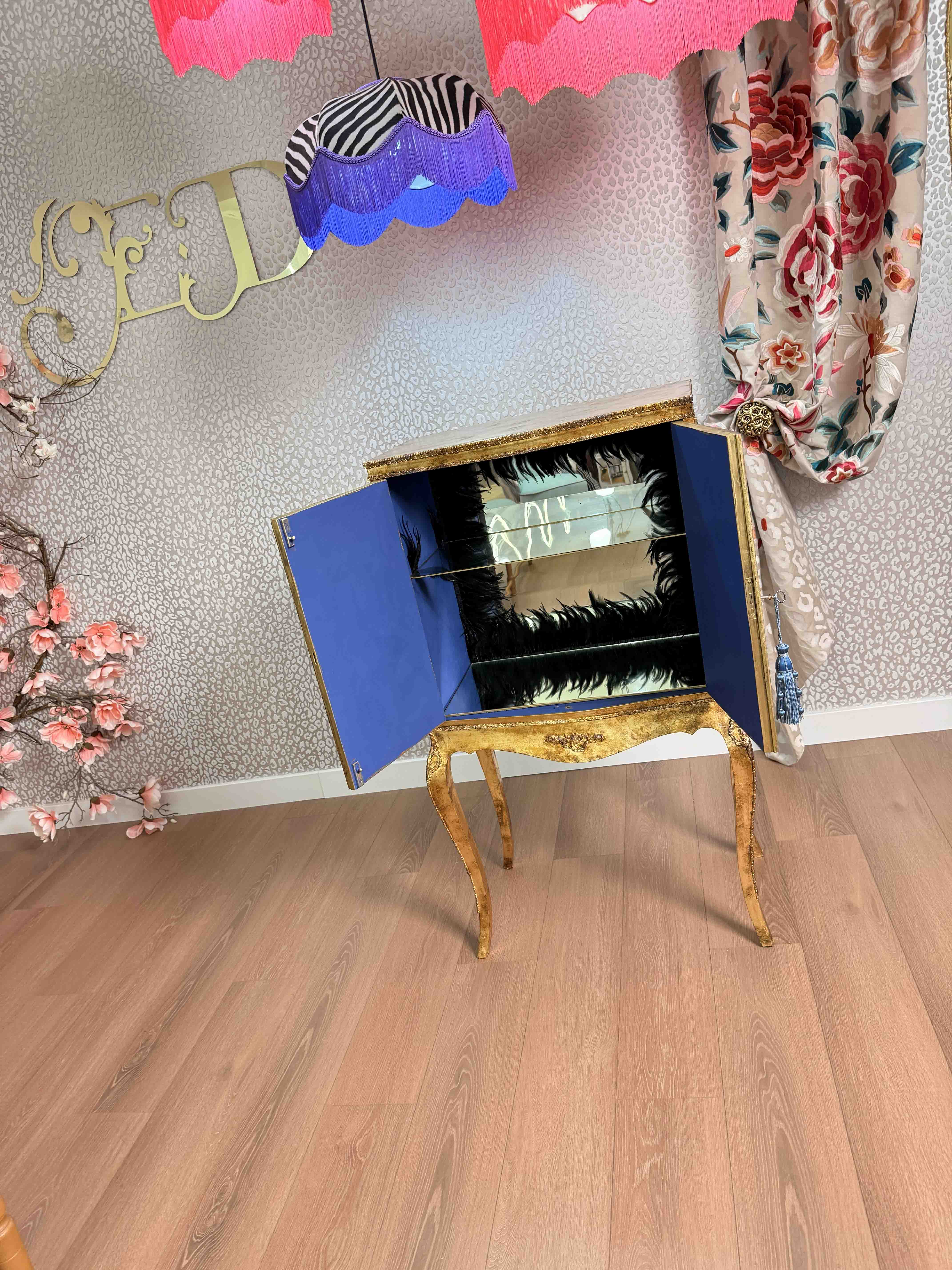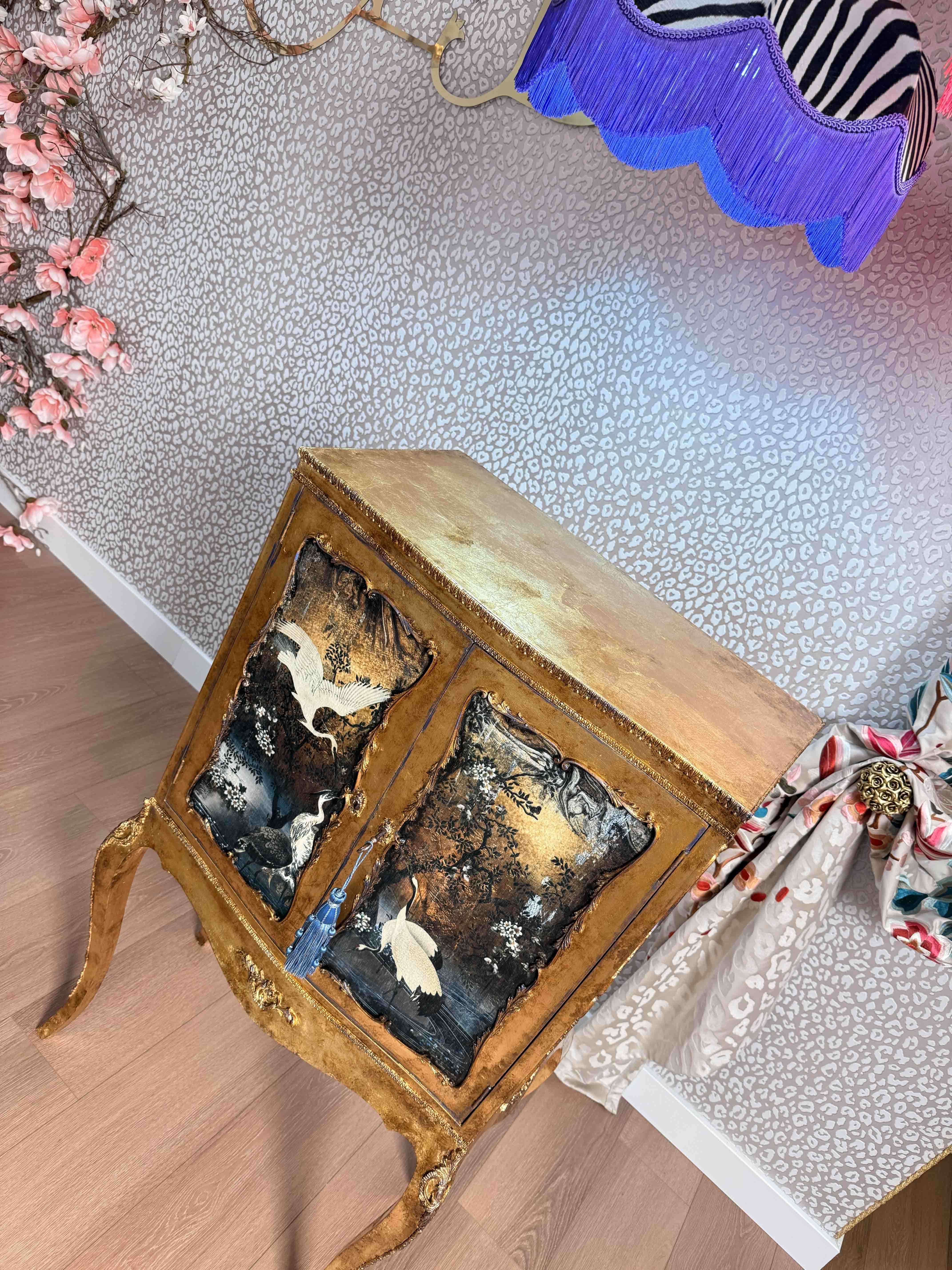Bar cabinet with gold leaf and decorative fiber, featuring flora and fauna motifs.
