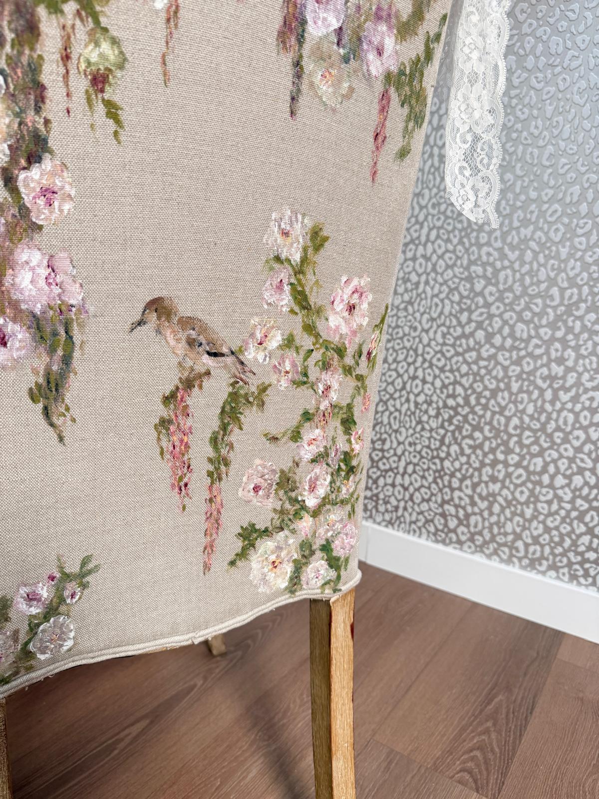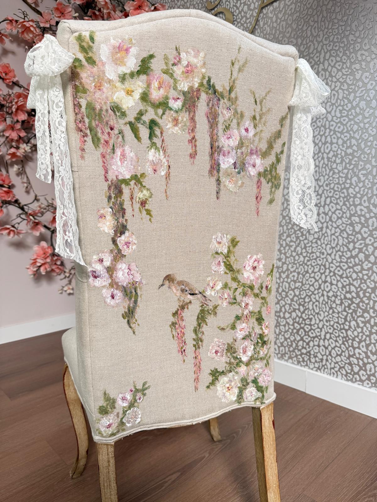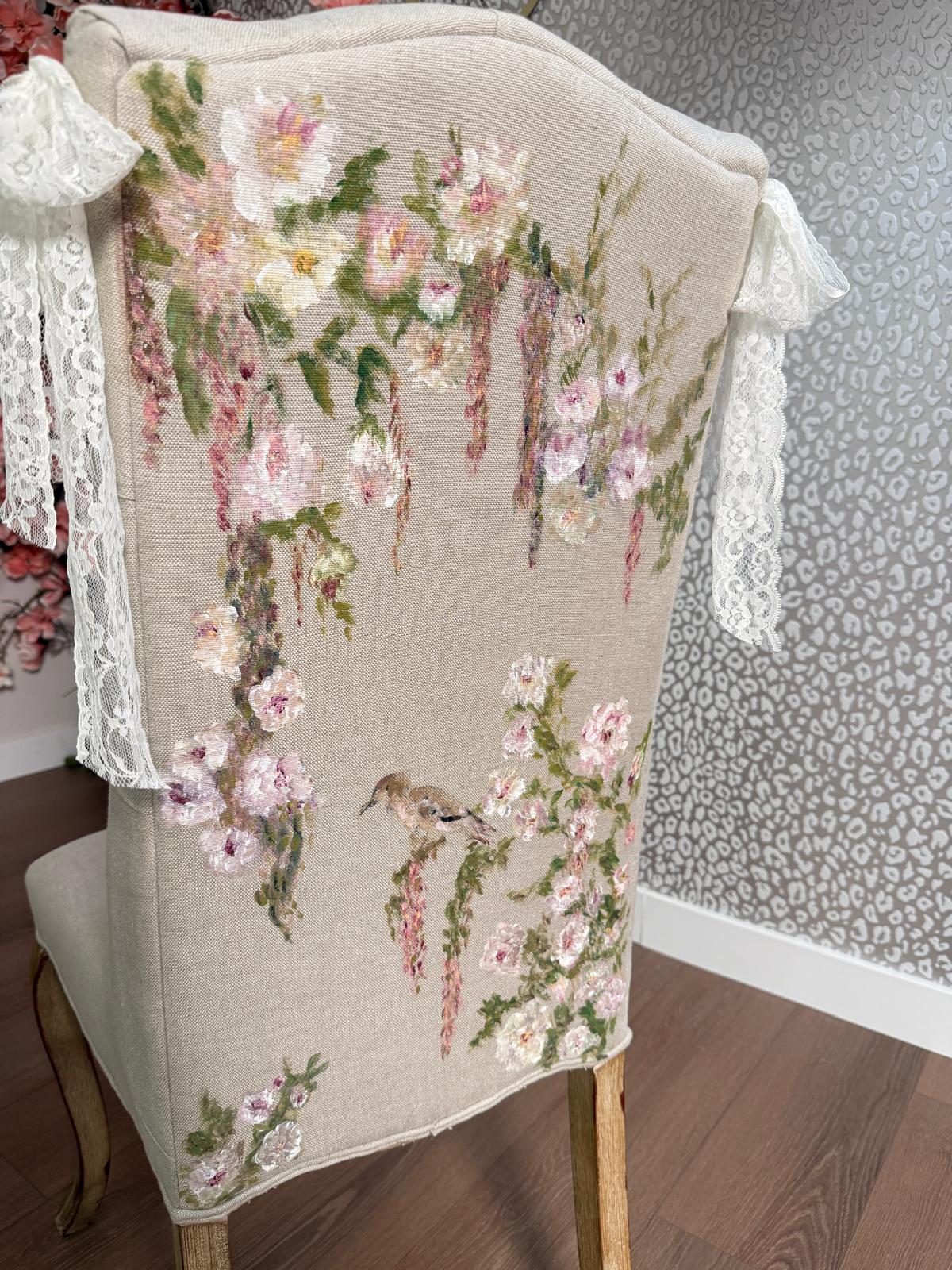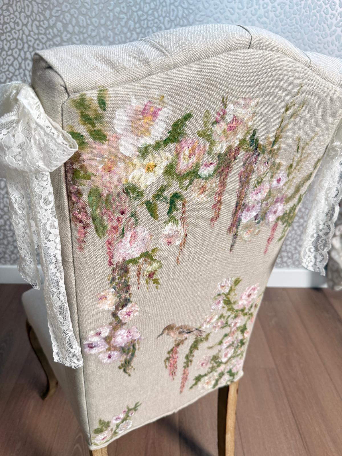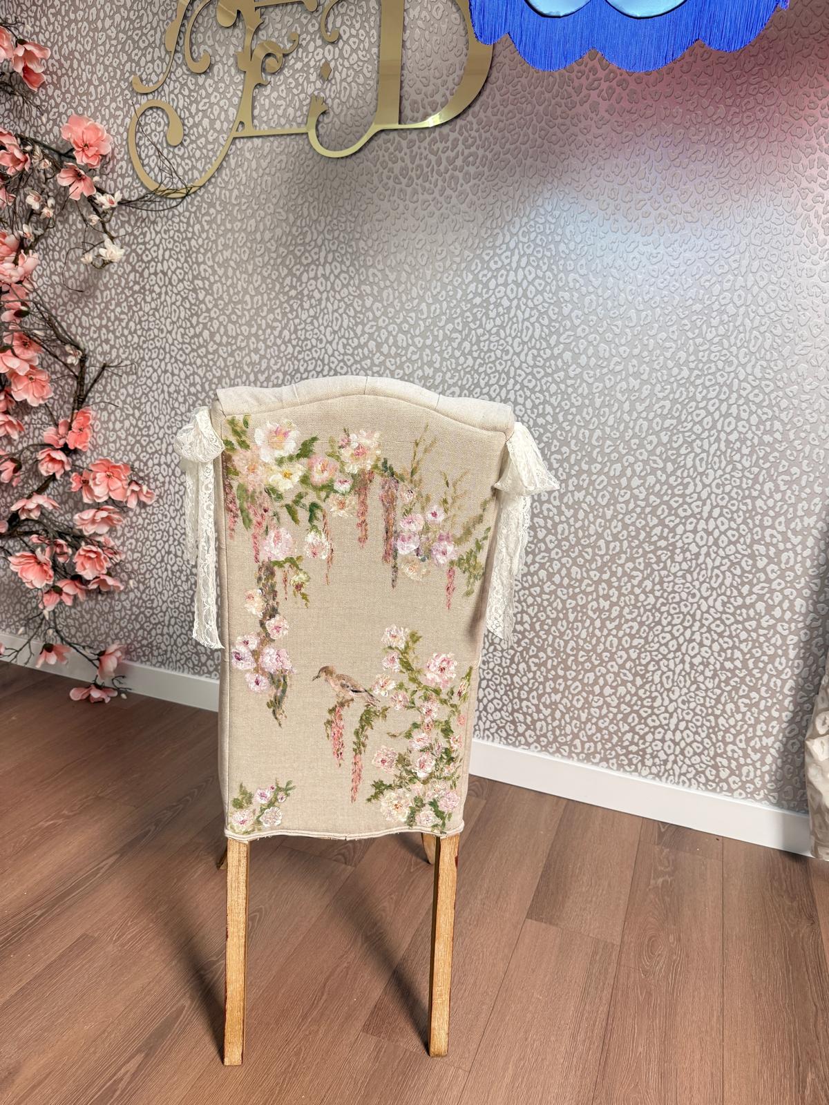 Cadeira estofada em linho, com efeito capitoné no encosto e pintada à mão (motivos de fauna e flora) nas costas.